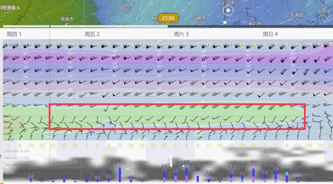 武汉周边区域的气温随海拔高度(纵坐标)和时间(横坐标)变化的数值预报结果。可以看到 2 月 2 日-4 日,这一区域约1000-3000米高空气温高于0℃(红框标出),但大气低层和地面又低于0℃,很有可能形成冻雨。